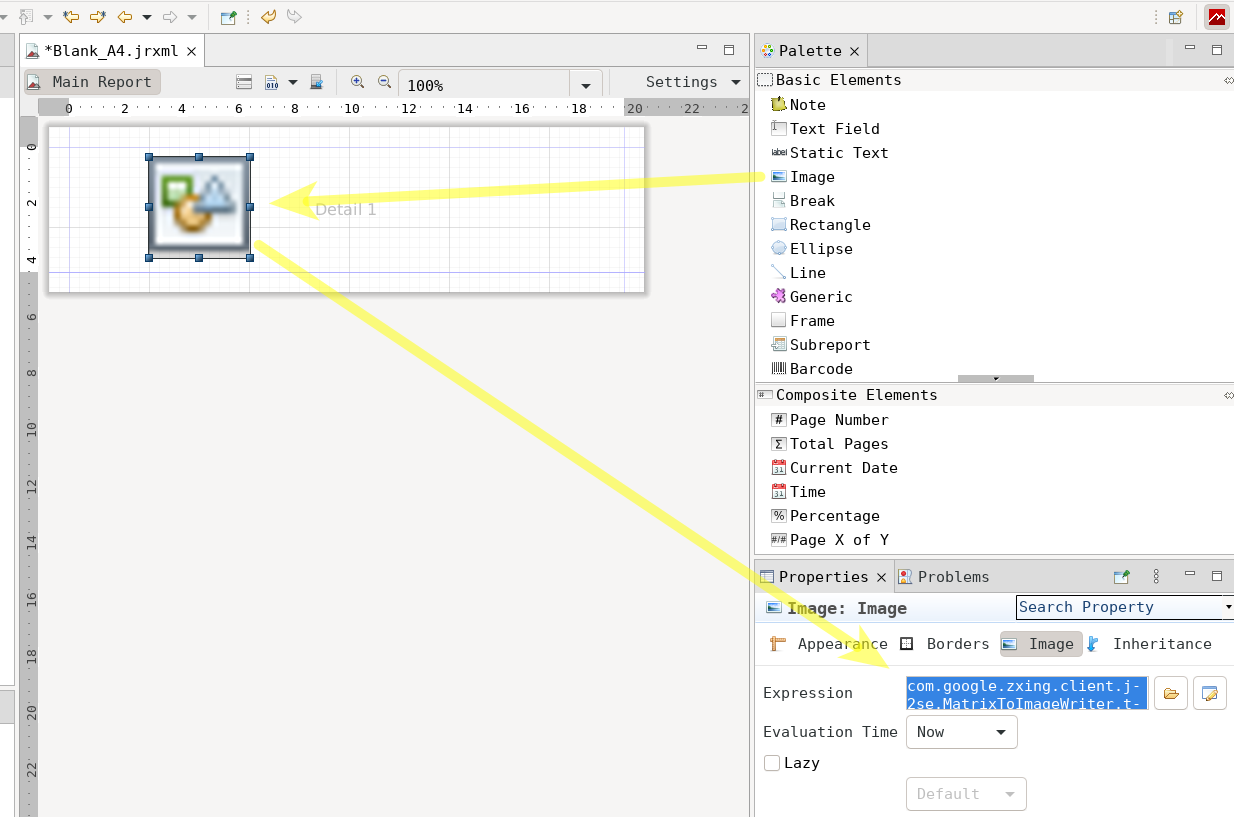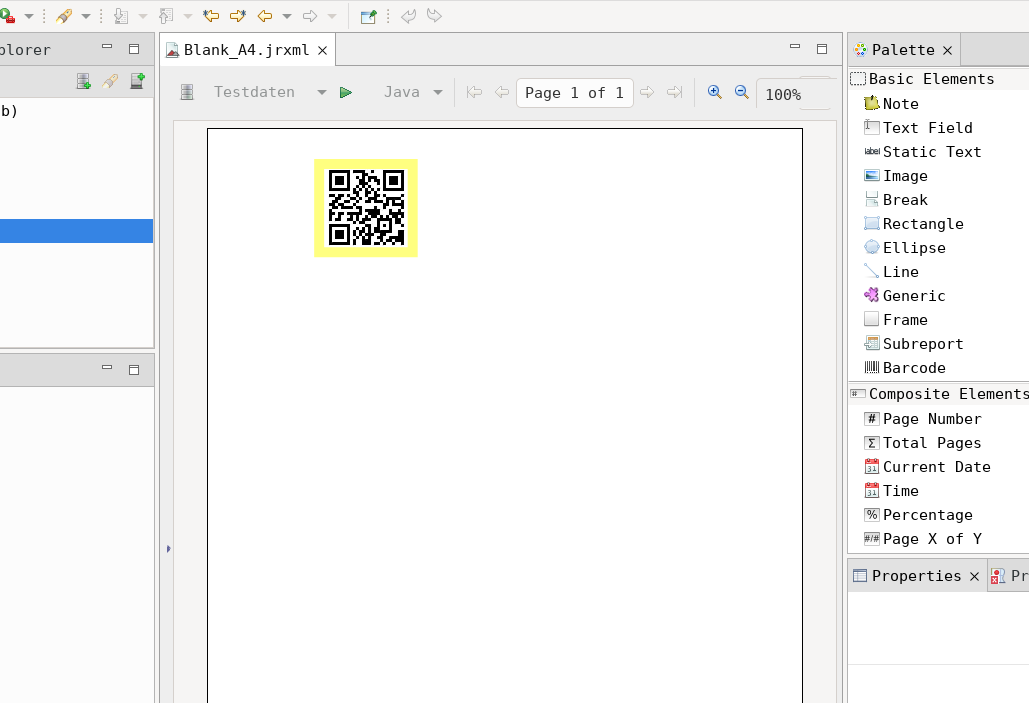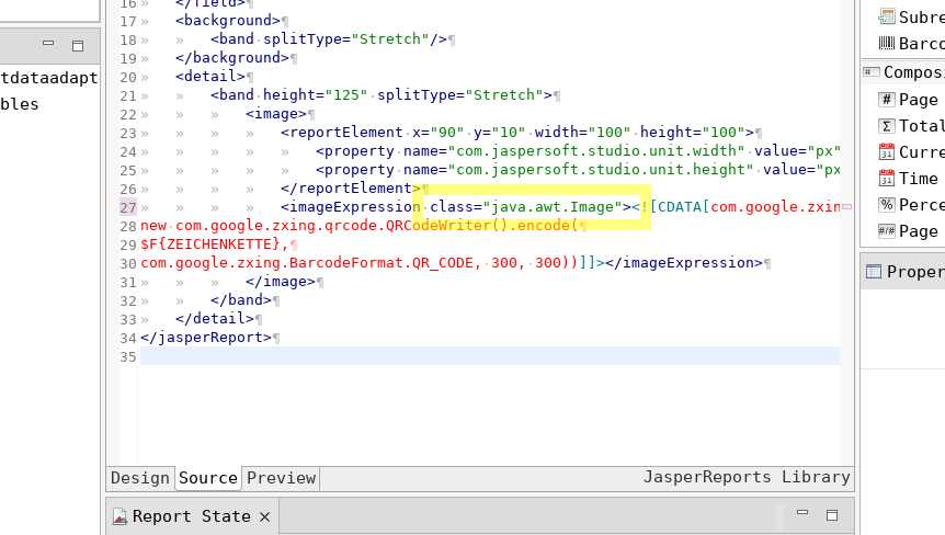 Danach wird im Report eine Image Datei eingefügt.In der Code Expression der Image Datei wird der statische Funktionsaufruf für die Generation des QR-Codes hinterlegt. Dieser beinhaltet das Feld mit den Daten aus der Datenquelle (hier $F{ZEICHENKETTE}). Des Weiteren kann über die statische Funktion encode der Klasse QRCodeWriter auch die Breite und Höhe geändert werden.