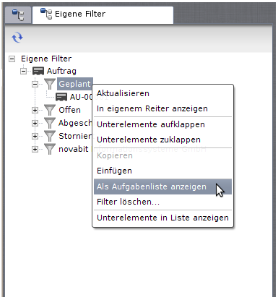 Der gespeicherte Suchfilter muss zumächst in der Baumnavigation "Menü/Datei/Meine Suchfilter anzeigen" angezeigt werden. Dann kann die Übertragung in die Aufgabenliste über einen Kontextmenüeintrag durchführt werden.